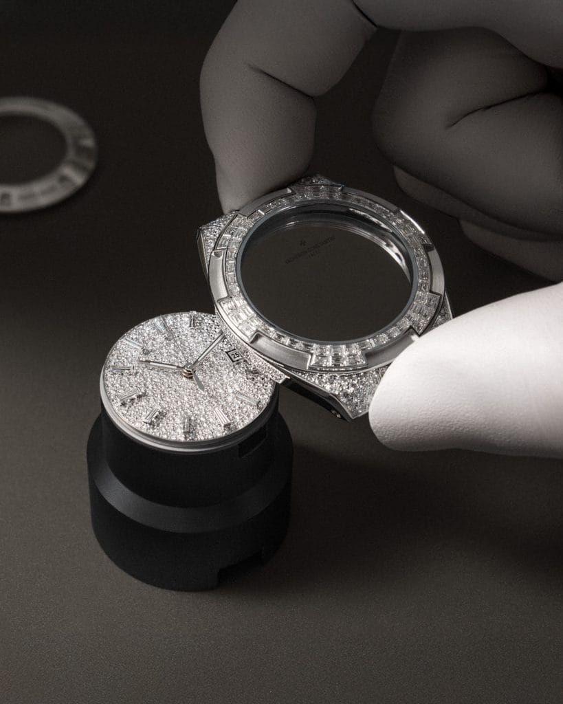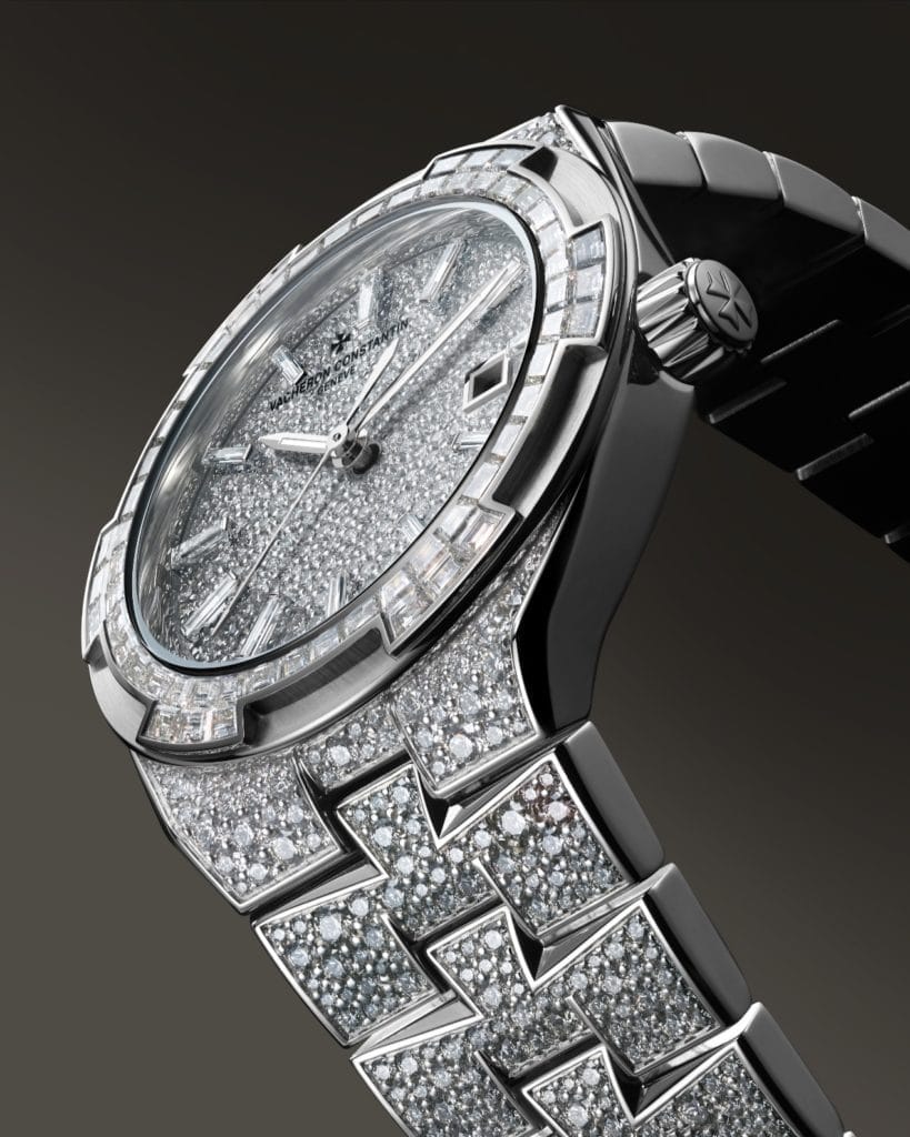 Fidèle à un savoir-faire joaillier cultivé depuis le XIXᵉ siècle, Vacheron Constantin pare ces nouvelles Overseas de 1 430 diamants, mêlant tailles brillant et baguette. La lunette hexagonale, inspirée de la croix de Malte, accueille 60 diamants baguette en serti invisible, une technique d’une extrême précision qui donne l’illusion de pierres flottantes.