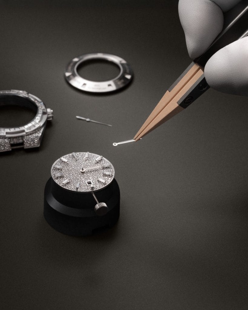Le cadran entièrement pavé adopte un serti neige de 314 diamants, créant une surface lumineuse et vibrante, tandis que les index baguette structurent l’ensemble avec élégance. Le bracelet en or, serti maillon par maillon, parachève cette approche où chaque détail est pensé comme une œuvre à part entière.