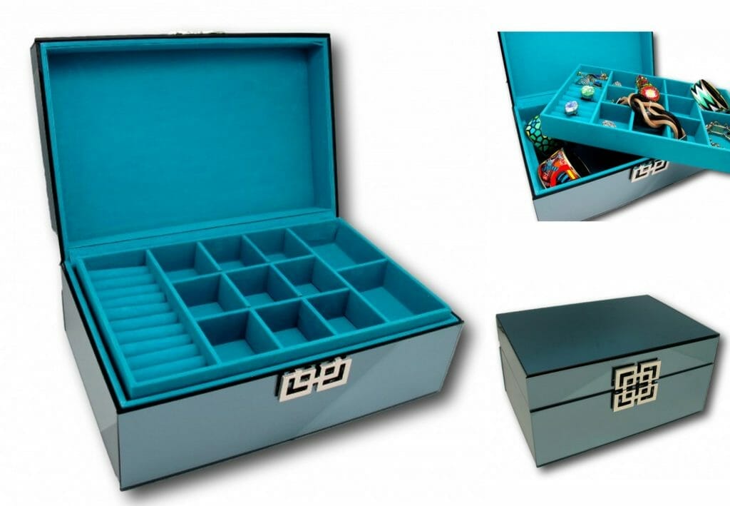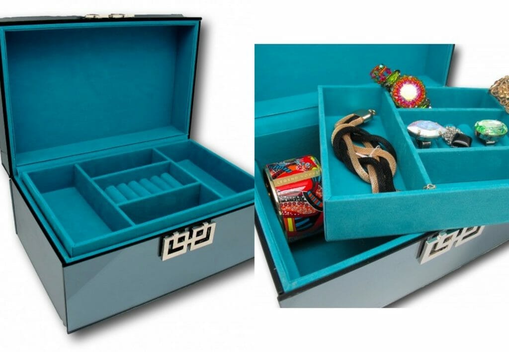 Ce coffret à bijoux en tissu de la collection Shan comporte un miroir interne donnant accès à un compartiment libre et un emplacement spécifique pour les bagues. Le coffret possède également deux tiroirs libres en face afin d’y loger colliers, bracelets, boucles d’oreilles, broches …